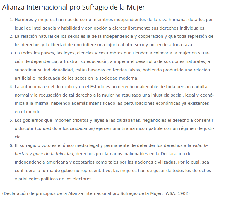 Ahora hemos probado todos los caminos. Hemos presentado más amplias peticiones que las formuladas por cualquier otra reforma; hemos triunfado en organizar mítines con más convocatoria que los organizados por cualquier otro movimiento. (…) Nos hemos enfrentado a multitudes hostiles en las esquinas de las calles, porque se nos ha dicho que podríamos no tener la representación que los hombres han ganado a menos que convirtiéramos la totalidad del país a nuestra causa. Porque hemos hecho esto, nos han desvirtuado, nos han ridiculizado y despreciado. La multitud ignorante ha sido incitada a agredirnos en las calles y nos hemos enfrentado a ello sin armas y sin los guardaespaldas que los Ministros del Gabinete si tienen. Sabemos que necesitamos la protección del voto incluso más que los hombres.
