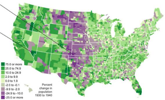 Moltes famílies s’endeuten i perden les seves terres i vides, veient-se obligats a migrar.Els estats que varen guanyar població entre 1930 i 1940, en verd. En morat, els que la varen perdre.Els migrants varen ser rebutjats a altres estats més rics: hi havia un excés de ma d’obra, formada per gent disposada a treballar en el que fos.