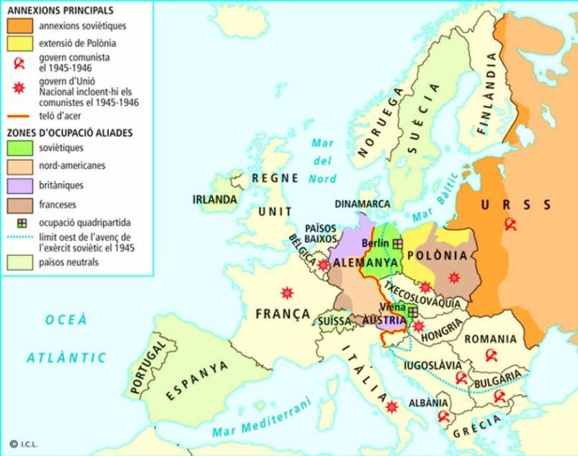 Conferència de Yalta (Crimea, URSS), celebrada el mes de febrer de 1945, amb Churchill, Roosevelt i Stalin. El president americà moriria dos mesos més tard, abans d’acabar la guerra, sent succeit per Harry Truman, el seu vicepresident. En aquesta reunió, aquests tres aliats amb un enemic comú (l’Eix), es repartiren Europa sabent que aviat serien enemics.En aquest mapa podeu comprovar la situació d’Europa l’any 1945. Espanya al 1943 havia deixat ser país “no bel·ligerant” (és a dir, aliat de l’Eix però sense entrar en guerra) a “país neutral”. Fixeu-vos com els països vencedors es repartiren Alemanya i Àustria, així com la URSS s’annexiona territoris.De 1945 a 1949 Grècia va viure una guerra civil, continuació de la guerra mundial, en la qual es va dirimir en quin bloc (comunista o capitalista) acabaria el país, molt proper geogràficament al bloc comunista. Finalment Grècia va reinstaurar la monarquia i va establir una democracia capitalista. Aquest va ser el primer conflicte d’una nova era.