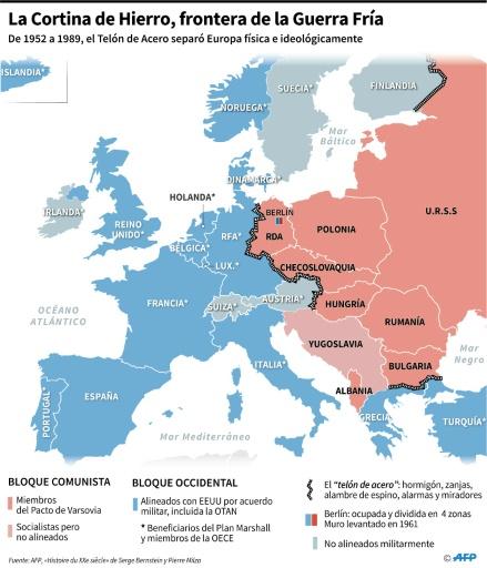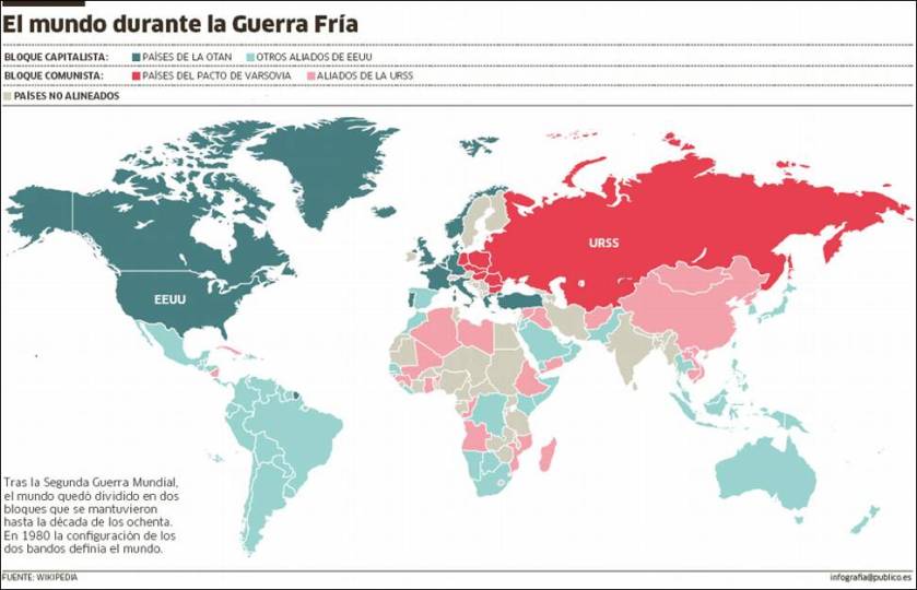 Països del bloc capitalista (OTAN) i països del bloc comunista (Pacte de Varsòvia). Observau com la RFA (República Federal Alemanya) forma part de la primera, i la RDA (República Democràtica Alemanya) de la segona. A més a més, notau com Espanya no és a la OTAN (no hi va entrar fins 1982). La raó és que, en els anys de la posguerra, la dictadura de Franco era vista com el remanent del bloc de l’Eix de la guerra, tot i que no hi va arribar a entrar mai. Ningú no volia fer-se una foto amb Franco, que se n’havia fetes amb Mussolini i amb Hitler. De totes formes, això no va impedir que els EEUU, a partir dels anys 50, consideressin Franco com un aliat contra el comunisme: el líder del capitalisme i la democràcia, si calia, s’aliava amb dictadors.