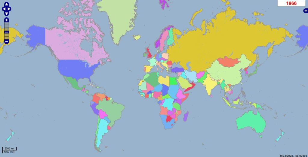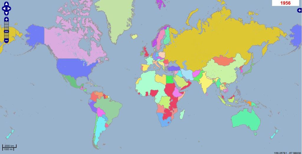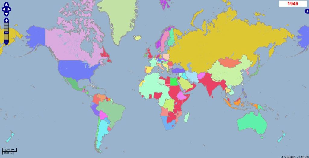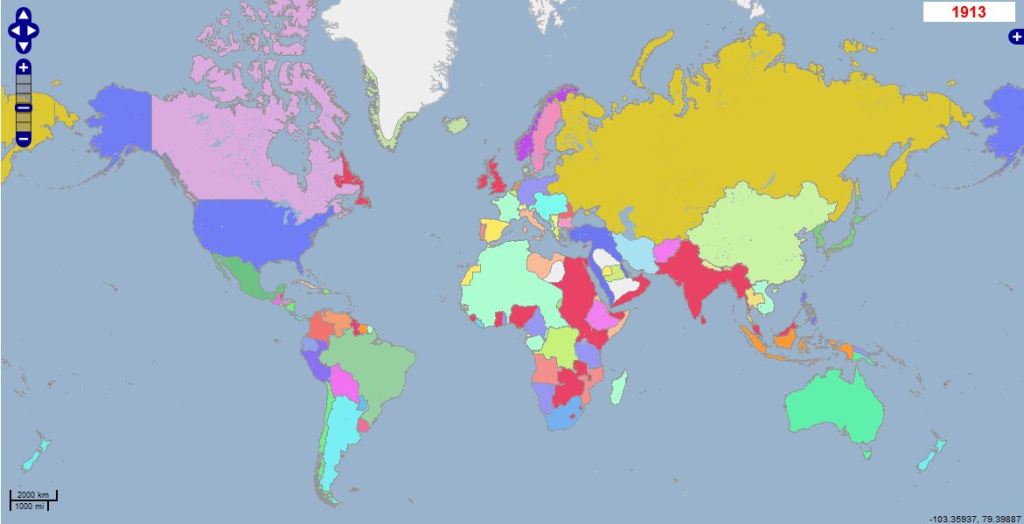 Al 1913 encara podeu observar el mapa anterior al Tractat de Versalles, així com els efectes plens del Tractat de Berlín de 1885.L’any 1946 han passat dues guerres mundials, el mapa d’Europa s’ha transformat totalment, però els grans imperis encara existeixen.Al 1956 es comencen a veure els efectes de la descolonització. Observeu que ha passat amb la Índia Britànica, i encara el mapa d’Àfrica no ha canviat essencialment.Per últim, l’any 1966 el mapa d’Àfrica ja és pràcicament el mapa que coneixem avui en dia.