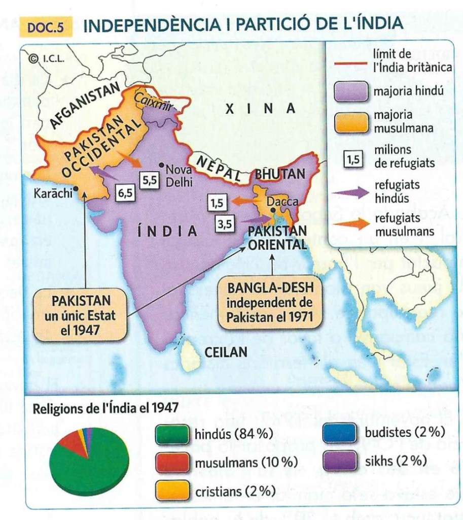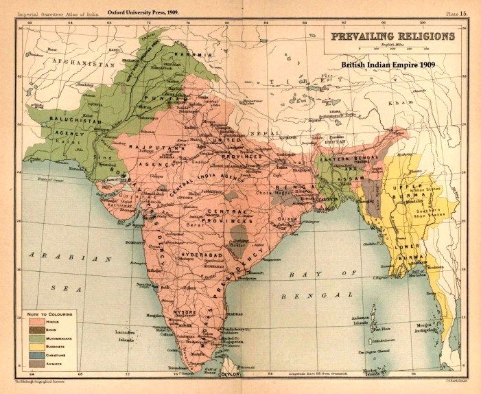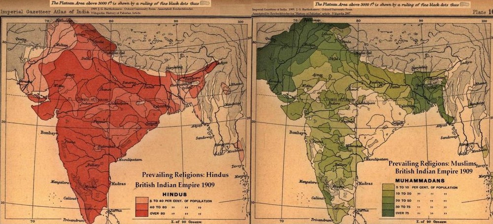 Mapa 1, que indica les religions predominant a la Índia britànica de l’any 1909. La llegenda, si no s’observa bé, indica majories hindús, sikhs, musulmanes, budistes, cristianes i animistes.Separació de castes de la religió hindú. Com podeu observar, no deixa de ser una divisió social, amb justificació religiosa.Zones amb majories hindús i musulmanes abans de la independència de Índia i Pakistan.Aquest mapa mostra els fets de 1947 i 1971 en relació als refugiats que es varen generar.