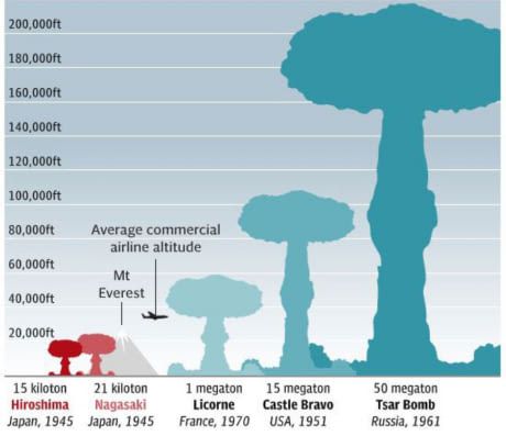 Comparació de bombes atòmiques (d’urani i d’hidrogen). Hiroshima era una broma. La bomba Tsar (lògicament soviètica) era tan gran que no era ni pràctica en cas de guerra, només per impressionar l’enemic. Va ser detonada a una illa de l’Àrtic. 200.000 peus són 60 km!