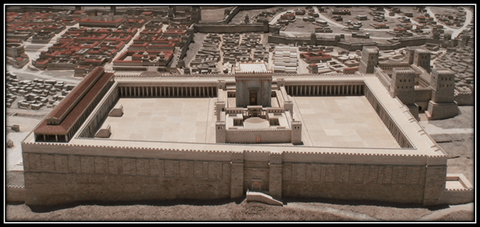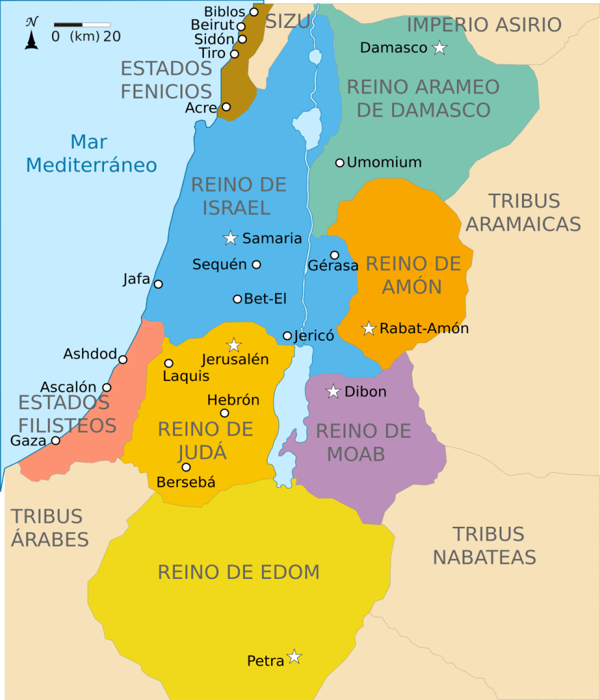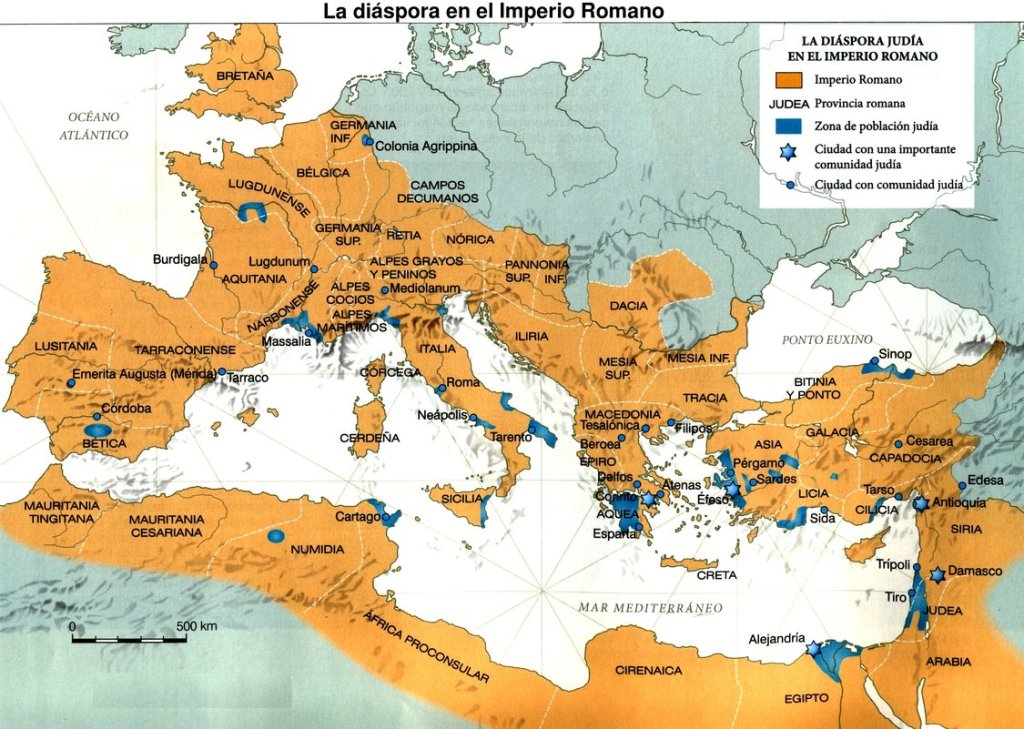 Segons la Bíblia, Yahvé va dir a Abraham que no calia sacrificar el seu fill en nom Seu, que bastava sacrificar un xot. I, el que és més important, que els seus descendents serien el “poble elegit” per Ell, els jueus.Mapa de la regió abans de la invasió romana. Els regnes d’Israel i Judà són jueus. Els filisteus són els antics palestins.Imatge del Temple de Salomó, a Jerusalem, que va ser destruit pels romans l’any 70 d.C.L’any 70 d.C. l’emperador romà Tit va expulsar els jueus d’Israel, i es va iniciar la diàspora (dispersió) dels jueus per tot l’imperi romà.