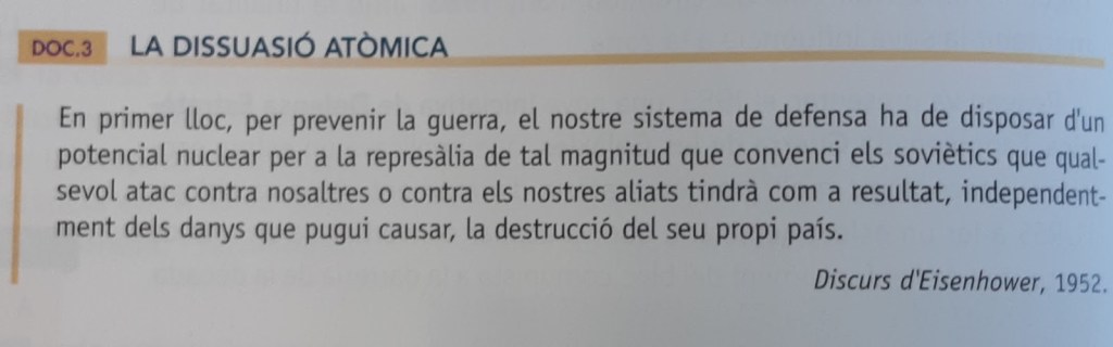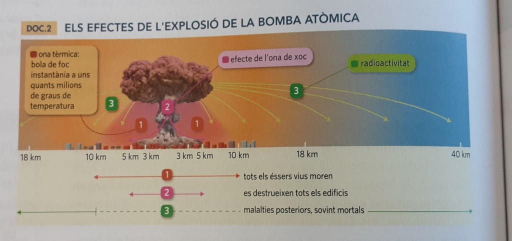 Fragment d’un documental de la BBC on es mostra de forma realista com va ser l’atac sobre Hiroshima, per fer-se una idea de com seria una guerra atòmica. A la pàgina 254 del llibre hi trobareu un esquema amb la distància que assoleixen els efectes d’una bomba com aquesta. Podeu posar subtítols al vídeo.